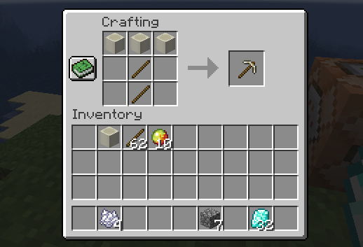 Bone pickaxes allows players to mine iron and gold ore. But here comes the next challenge: Stopping players from immediately proceeding to diamonds. My best idea here, is to make **Diamond Ore drop Raw Diamonds** - so Diamond Ore they can be mined using iron pickaxes, but Diamonds can't be used until the player has the right tool/stuff to process/polish the diamonds. This tool/stuff needs to be challenging to get too, and preferable only obtainable after getting the iron tools. I suggest putting it in the Nether. "But wait," you might say, "how does the player get to the Nether without diamonds?" That's a good question, either they use one of the randomly ruined portals which generate everywhere anyway, or we have to make iron pickaxes able to mine obsidian - and it should take awfully long of course. The latter a safe and easy solution and I would have done that if it was possible to do with data packs. Instead I took the chance and **adjusted some of the loot tables**, which needed to be done anyway. If we want to make iron and diamond harder to get, it should not appear in so many dungeon/mineshaft/blacksmith/ruined portal/jungle temple/dessert temple chests.
