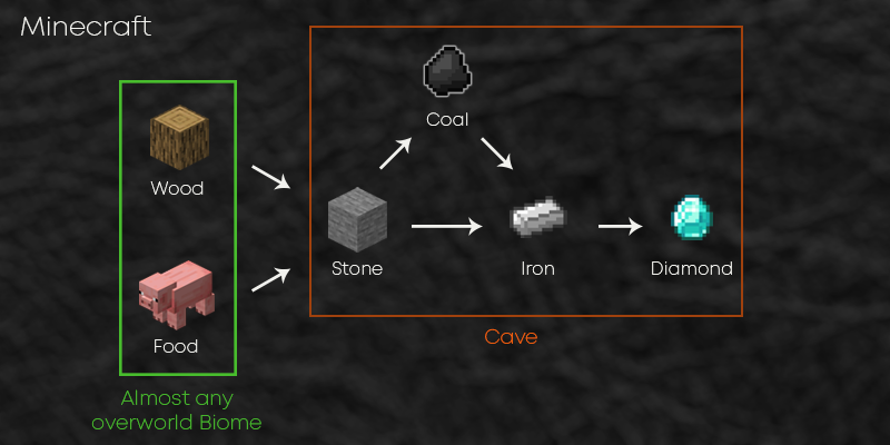 Initially, I stated that Minecraft's progression is easy, but to be more specific, the problem is that it is boring. And the reason it is boring is because it is very linear. When you spawn, just get some wood, maybe some food (just a few pigs/cows will do), then go in a cave, mine some stone, coal, and iron. If you find a good cave, you should have iron gear before the second night. Maybe even some diamond gear. That's the first four tiers done.
