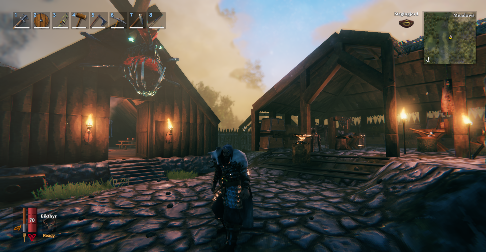 You want better armor and weapons because getting to the next tier also requires killing a boss. In fact, all tiers requires killing a boss. But not only do you have to kill it, you have to find the summoning locations first, which you do by exploring dungeons and ruined structures guarded by mobs, and you have to explore a new and more hostile biome. As you can hear, there is a lot fighting in Valheim, and to make the fights easier, you have to interact with the other systems of Valheim. This includes building a better shelter with better furniture to get a better resting buff, farming and hunting to make better food which gives more max health.